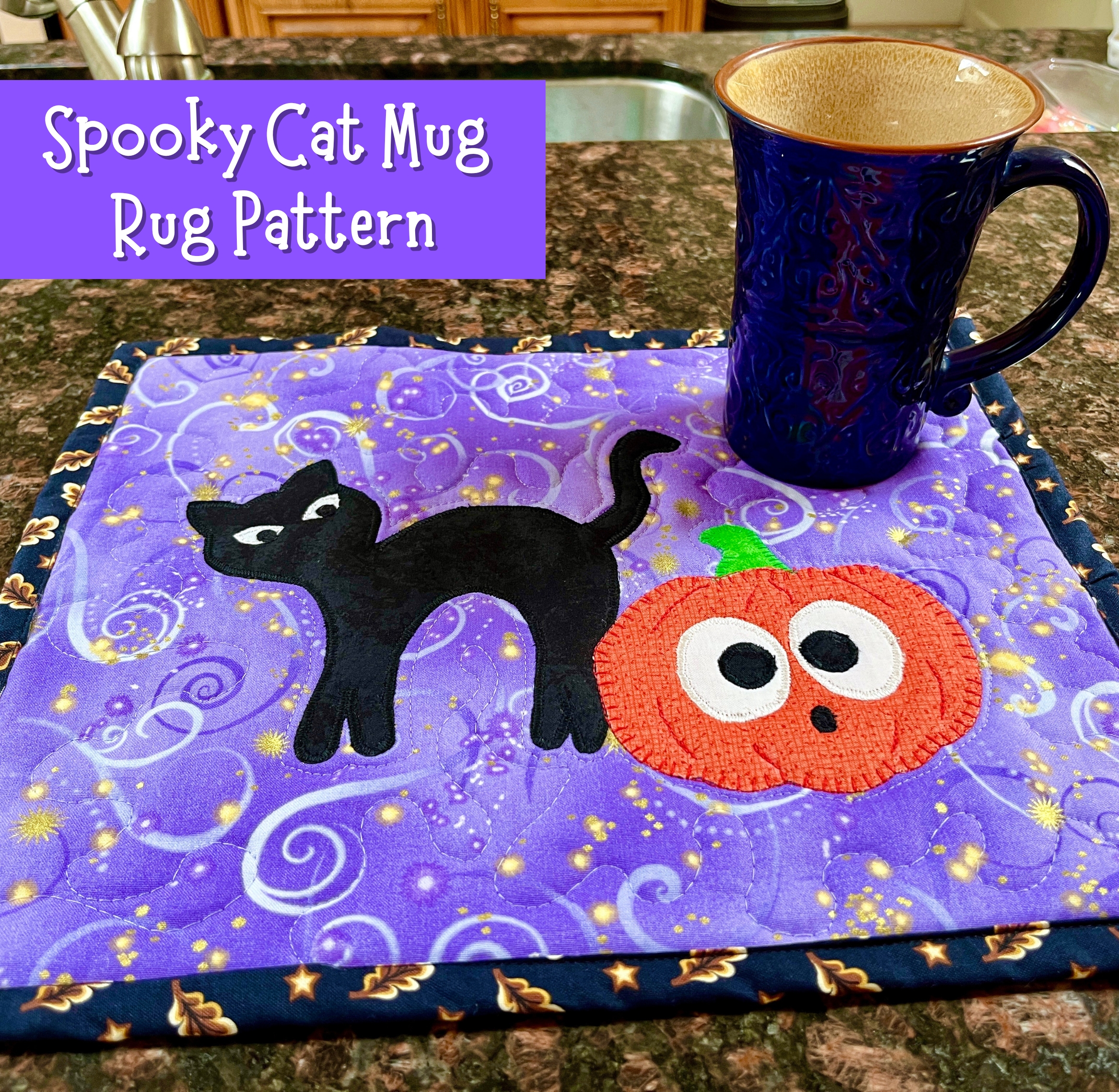 Halloween Spooky Cat Mug Rug, - approx 11"x 13" - Complete Instructions Tutorial is included. Also included is a guide for Fusible Applique.