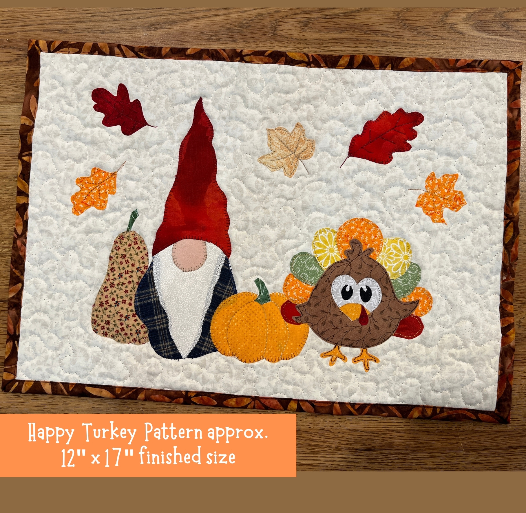 This is an adorable turkey and gnome mug rug, bar rug, or small wall quilt - including layout plans. Instructions are detailed and illustrated with diagrams. and elements reversed for convenience. Appliques are quickly and easily created with fusible web sewn with machine zig-zag, blanket stitch, straight stitch, or hand stitching. approx. 12"x17".