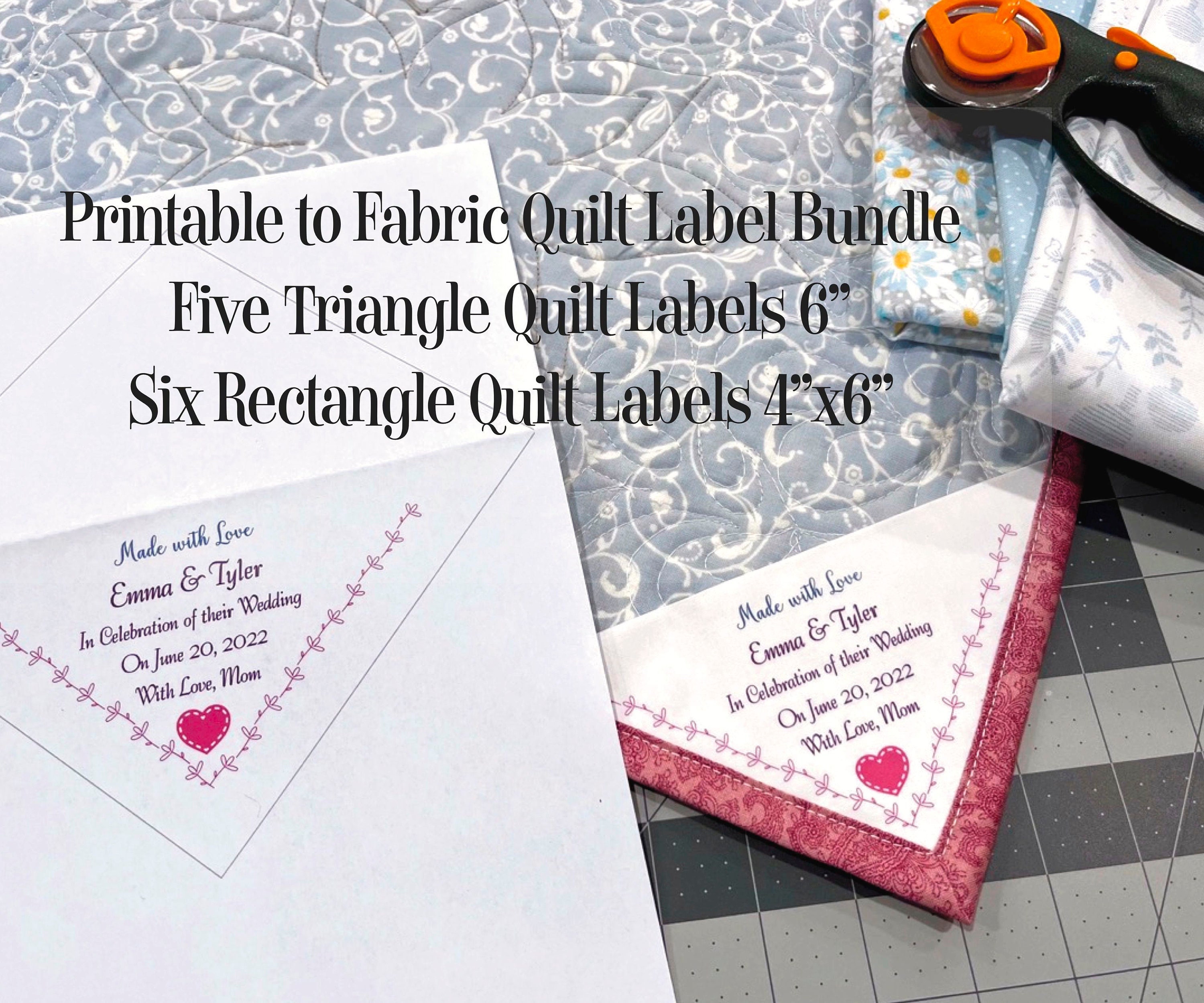 Labels are sized to print onto a standard 8-1/2” x 11” printable fabric sheet using your printer. There are various sizes and colors to coordinate with your quilts.